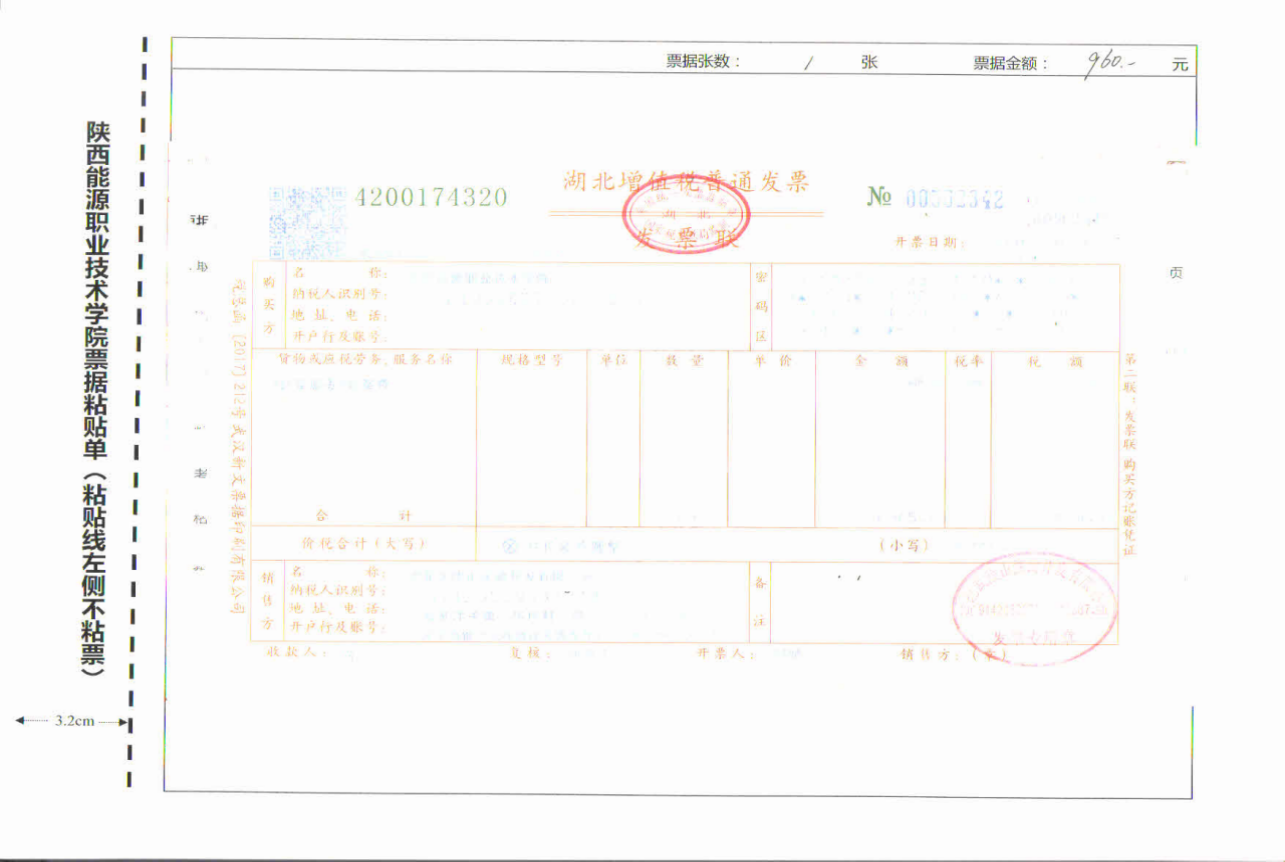 2)变更后的记账凭证装订线位于左侧 3.2cm 处(横向放置)。因此粘贴发票时,应注意不要超过左侧粘贴框,以左侧粘贴框对齐为原则。发票之间也应留有稍许空间,当同类的发票未贴满一张粘贴单时,可继续粘贴其他类发票,以节约纸张。若单张发票(电子类)的大小等于或者超过 A4,则不需要贴在粘贴单上,可直接附在报销材料中即可。