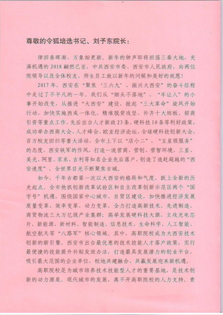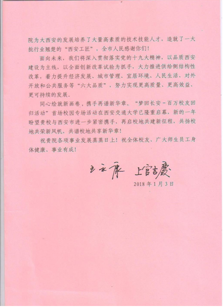 中共西安市委书记王永康、市长上官吉庆向我校师生致新年贺信