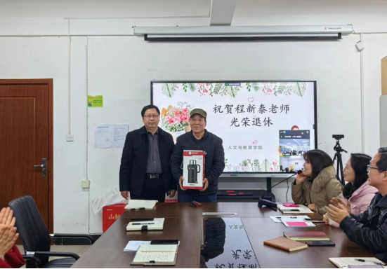 接下来,人文学院工会精心策划了一场温馨而特别的欢送会,为即将退休的老教师程新泰送上祝福与感谢。人文学院党总支书记买中傲为程老师送上了慰问品和书法作品,回顾了程老师三十年如一日的辛勤付出,赞扬了他无私奉献、爱岗敬业的精神,并希望程新泰老师退而不休,续写更加精彩的人生篇章。希望程新泰老师退休不褪色,离岗不离心,在安排好退休新生活的同时,常回“家”看看,见证并分享学校发展的成果。