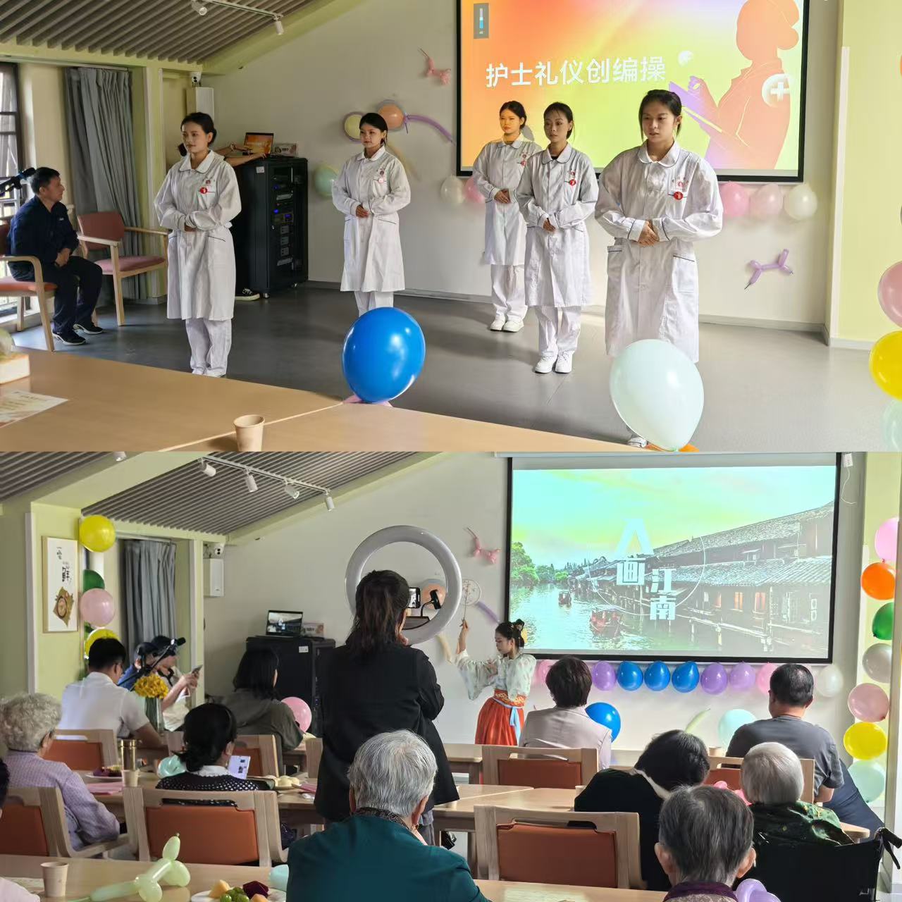 活动开始前,颐养中心杨淑维院长致辞,为长者送上最美好的节日祝福,同时感谢我院参加本次活动。 随后,一场精彩的文艺演出在这里隆重举行。舞蹈、歌曲、秦腔等节目轮番上演,会场气氛热烈祥和,老人们大饱眼福,尤其是我院学生表演的护士礼仪创编操及汉服舞蹈,赢得了老人们的一阵喝彩,老人们喜笑颜开,表示这样的活动很新颖、很有意义,让他们感受到了浓浓的节日气氛。