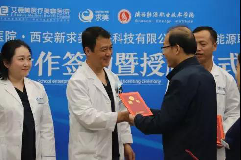 陕西能源职业技术学院科研处处长闫光准代表学校授予西安艾薇美医疗美容医院为校企合作单位,艾薇美第三片区人事总监卞鹤接牌。
