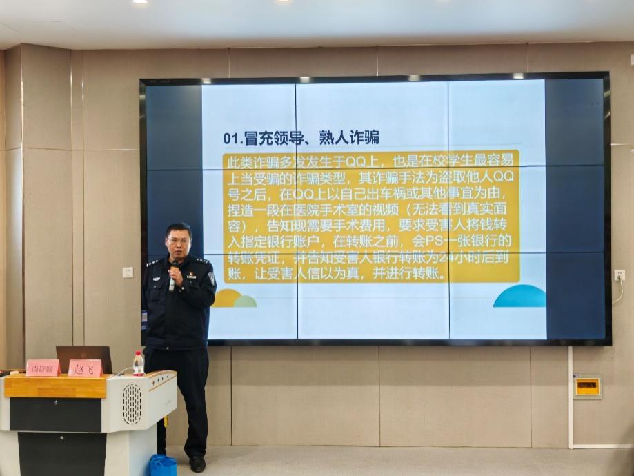 活动现场,西安市临潼分局斜口派出所一级警长赵飞,通过生动案例讲解,揭示常见诈骗手段。从网络刷单骗局到冒充公检法诈骗,每一个案例都让学生们深刻认识到诈骗的隐蔽性和危害性。在禁毒宣传时,各类毒品图片吸引了同学们的目光。赵警官耐心讲解毒品的种类、危害及防范措施,让大家直观地了解到毒品对个人、家庭和社会的巨大破坏。