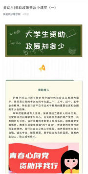 护理学院于6月1日-6月5日利用护理学院公众微信号为平台,推出资助知识普及小课堂三期,分别从大学生国家资助政策须知;我国资助政策发展史;国家助学贷款和生源地助学贷款区别三方面,向学生推送了相关内容,旨在让校学生清楚国家资助政策,了解相关资助知识,基本达到了全员普及的最终目标。
