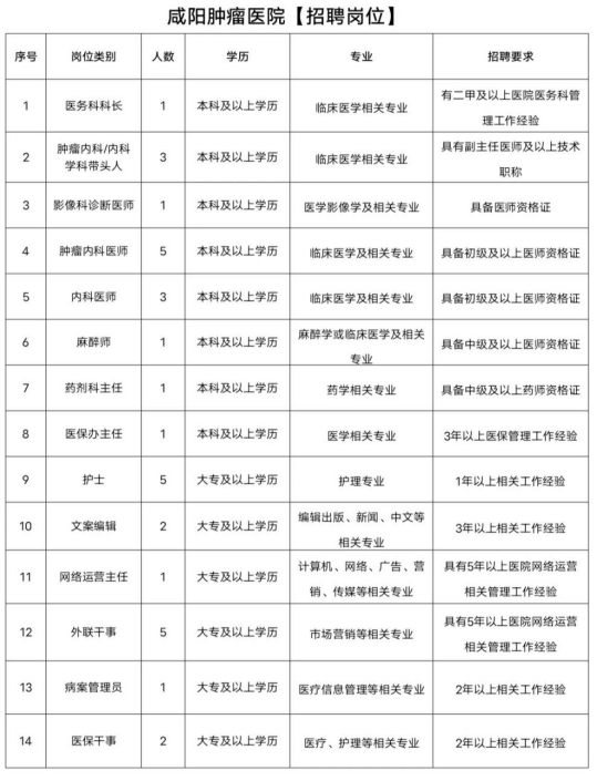 咸阳肿瘤医院是陕西省“有突出贡献专家”李去病院长领建的以治疗恶性肿瘤疾病为主的大专科小综合医院,成立于1992年11月,为咸阳市“涉外定点医院”,咸阳市城镇职工、城乡居民医保定点医疗机构,咸阳市门诊大额慢性病定点医疗机构,西安市城镇职工、城乡居民医保定点医疗机构,西安市门诊慢性病定点医疗机构,国家异地保定点医疗机构。