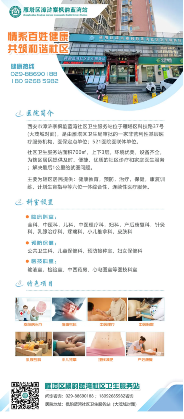 详细地址:雁塔区科技路37号(大茂城对面)漳浒寨枫韵蓝湾社区卫生服务站