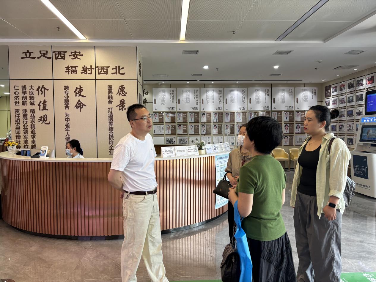 在西安市和平中医医院院长王明春的陪同下,4名教师先后参观了医院门急诊区域及护理院老年照护区。医院依托“中医诊疗+现代康复+智慧养老”三位一体的服务模式,在慢性病管理、失能老人照护及智能化养老设备应用等领域展现出先进经验,充分体现了“医养结合”的创新实践。医学护理学院教师重点了解了穴位贴敷、艾灸理疗等中医特色护理技术在老年群体中的临床应用,并与医院护理骨干就操作规范展开现场交流探讨。