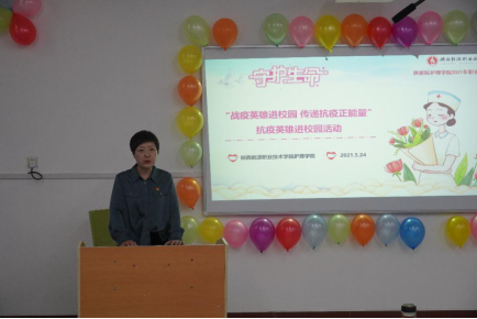 根据《护理学院2021年职业教育活动周工作安排》,为弘扬伟大抗疫精神,培养学生职业认同感,激发学生爱国主义情怀,陕西能源职业技术学院护理学院邀请到援鄂抗疫英雄—西安大兴医院泌尿外科/脊柱外科副护士长吴明,为护理学院师生做“责任 担当”专题报告。护理学院全体教师及学生代表150余人参加,报告会由护理学院党总支书记王瑜主持。