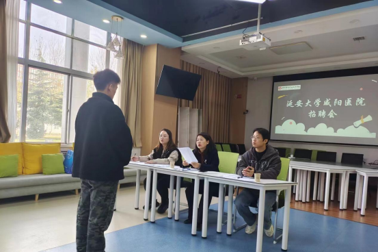 护理学院党政领导首先与延安大学咸阳医院院长助理兼护理部主任杨敏一行三人进行了会谈,双方就企业情况、学生实习、就业招聘等方面进行了沟通。护理专业2024届毕业学生从省内各地的实习单位返回学校,手持精心准备的简历,迈着铿锵的步伐、带着自信的微笑,认真准备随后的面试环节。延安大学咸阳医院也真诚地向学生发出邀请,并在宣讲会上耐心地讲解公司的规章制度、福利待遇、企业文化等学生关心的系列问题。