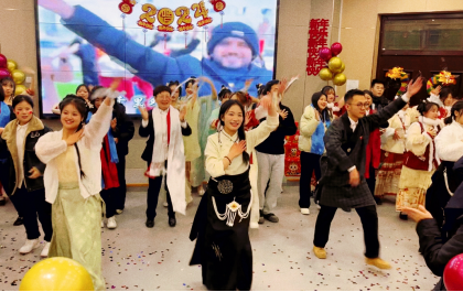 最后,能歌善舞的藏族姑娘们为大家带来了民族舞蹈——《家乡姑娘》,优美的舞姿展现着独特的民族魅力,她们热情的邀请全体师生一起共舞,将晚会气氛推向了高潮。