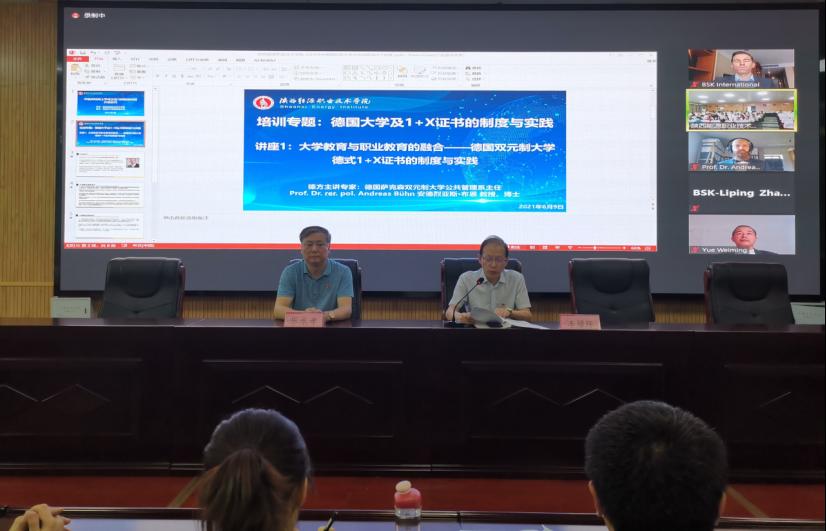 此次活动由德国BSK国际教育机构举办,通过ZOOM全球高清云视频会议软件在线进行,邀请德国萨克森双元制大学公共管理系主任安德烈亚斯·布恩教授主讲,岳维明副教授担任翻译。安德烈亚斯·布恩教授结合萨克森双元制大学办学实际,从学生入学资格、办学制度、校企合作、人才培养、课程设置及实践教学等环节向与会人员分享了双元制大学的办学理念和实践,以及“1+X证书”在德国双元制大学中的制度和实践