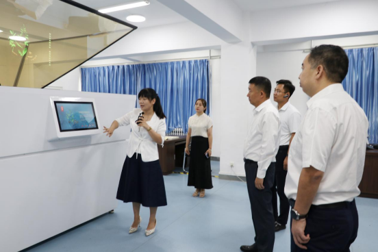 医学技术学院副院长李蕊(左一)介绍数字中医药文化科普基地