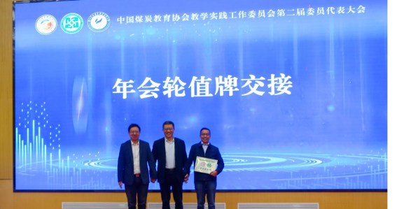 之后,王慧凌代表教学实践工作委员会向承办单位兰州资源环境职业技术大学颁发会议纪念牌。本次会议承办单位兰州资源环境职业技术大学校党委书记雷江红、教学实践工作委员会主任委员刘予东、下届会议承办单位云南能源职业技术学院副校长桂林斌进行承办会牌交接仪式。