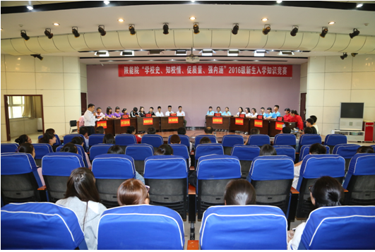 本次知识竞赛分个人赛和团体赛两部分,以校史校情、校规校纪、安全文明常识、系部专业认知、《学生手册》、《综合素质考评办法》、《三好学生、优秀学生干部评选办法》、《奖学金评定办法》、《勤工助学管理办法》等为主要内容,由院团委统一命题,各系部组织学生积极参赛。经过前期的学习和准备,最终各系选拔36名学生参加9月27、28日在咸阳、临潼校区举行的团体赛,经过个人必答题、团队必答题、抢答题、风险题等环节的激烈角逐,最终经济管理系、医学护理系代表队分别获得团体赛一等奖。竞赛现场设有互动环节,观看比赛的2016级新生踊跃答题、热情参与,现场气氛热烈。