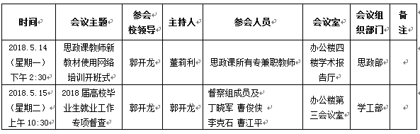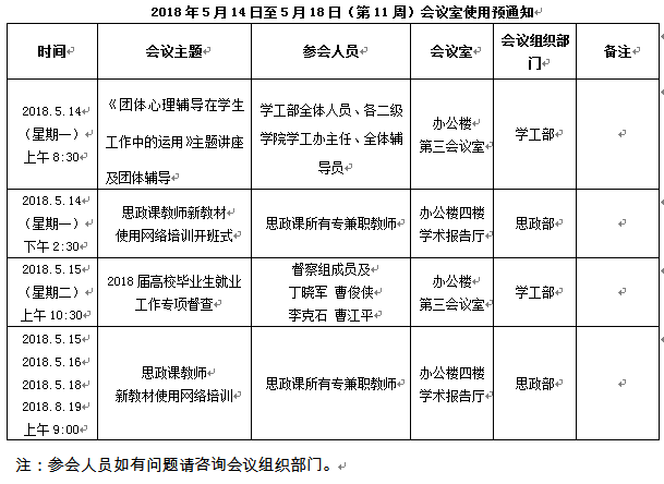 2018年5月14日至5月18日(第11周)会议安排预通知