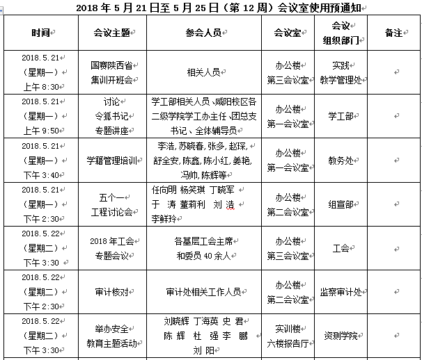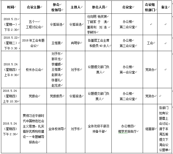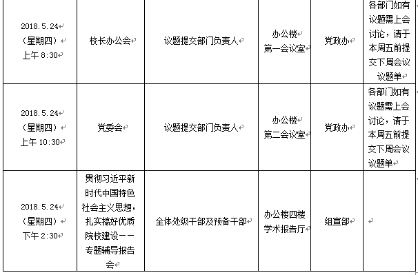 2018年5月21日至5月25日(第12周)会议安排预通知