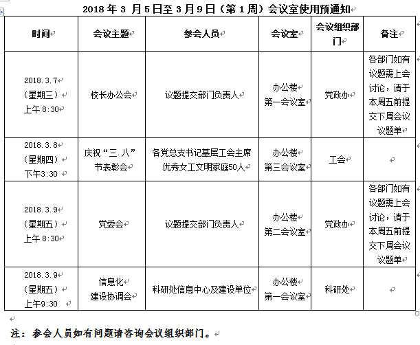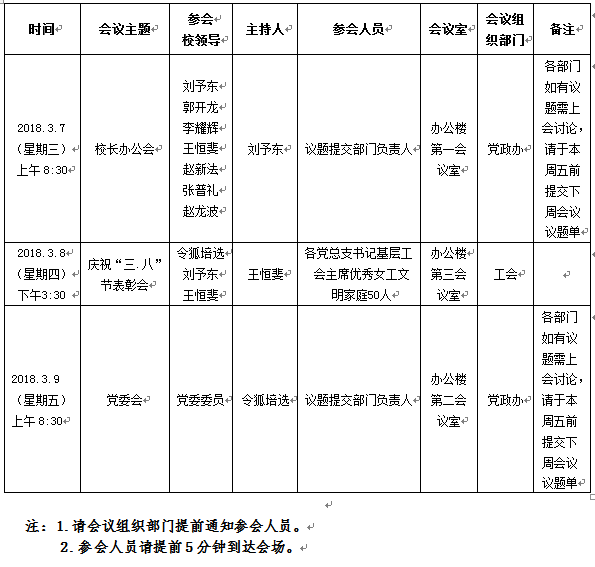 2018年3 月5日至3月9日(第1周)会议安排预通知