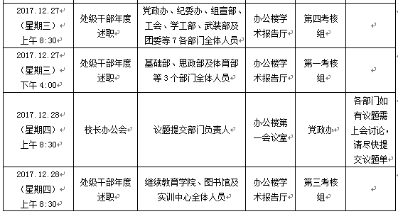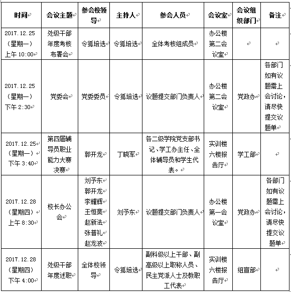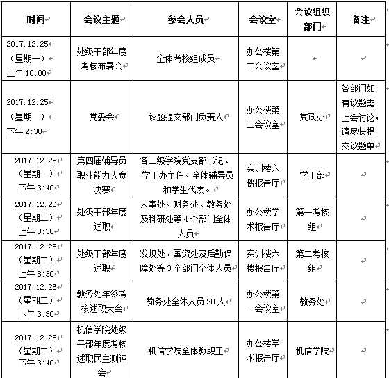 注:1.请会议组织部门提前通知参会人员。 2.参会人员请提前5分钟到达会场。 2017年12月25日至12月29日(第 18周)会议室使用预通知 注:参会人员如有问题请咨询会议组织部门。