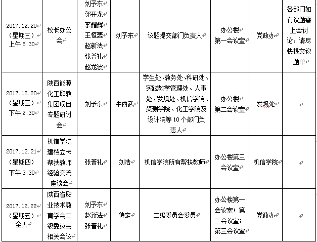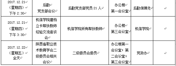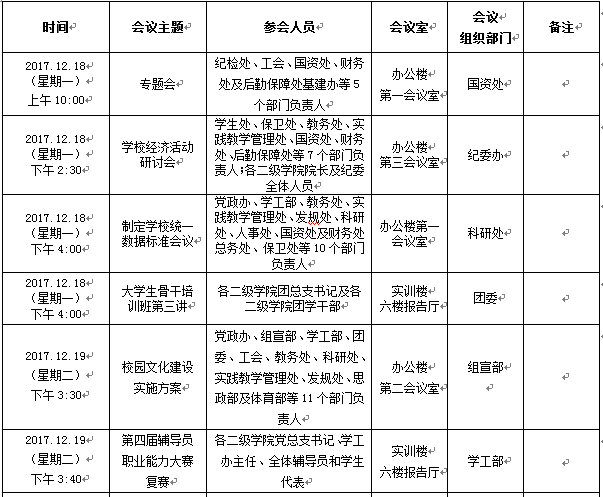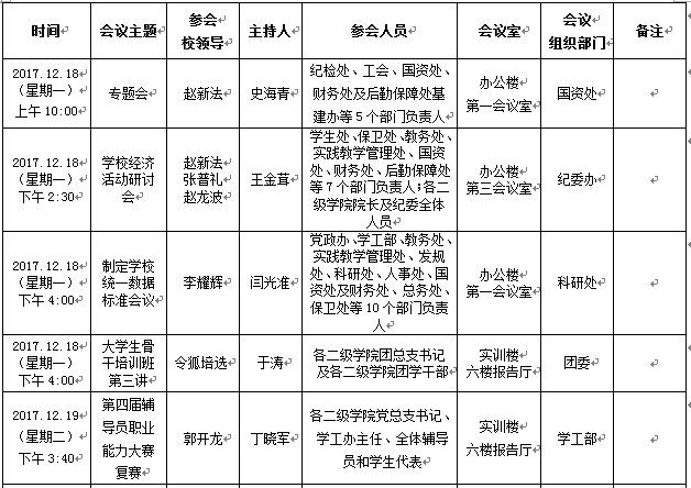 2017年12月18日至12月22日(第17周)会议安排预通知