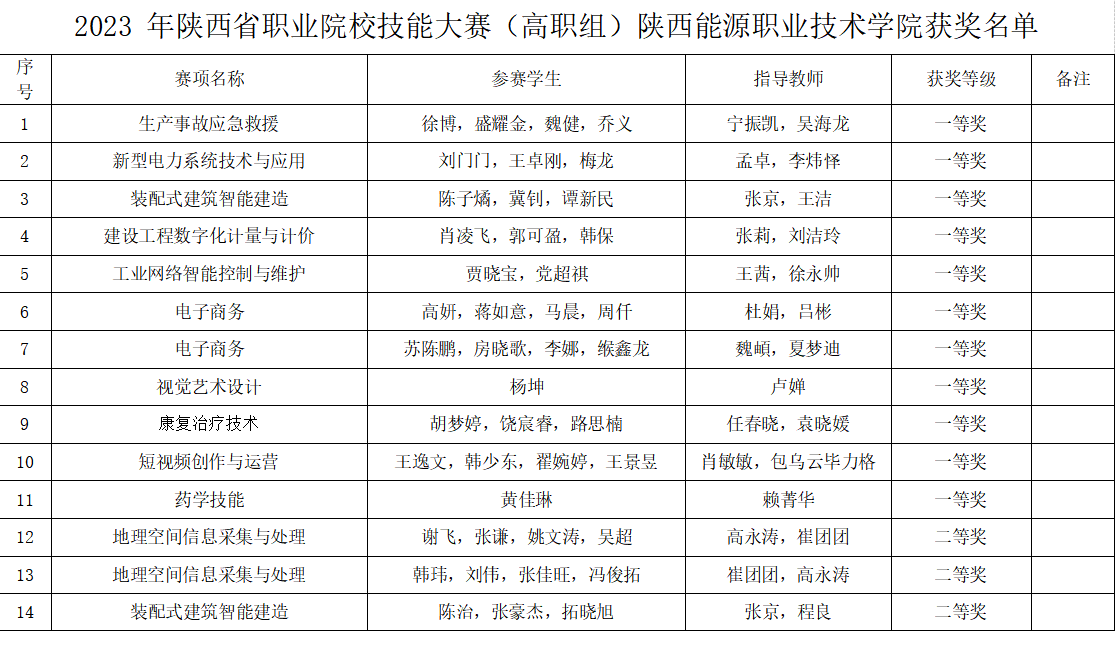 近日,由省教育厅组织开展的2023 年陕西省职业院校技能大赛成绩公布。我校139名选手在31个赛项中荣获一等奖11项、二等奖16项,三等奖28项,共计55个大赛奖项的优异成绩,同时我校被授予“高职组”优秀组织单位,“中职组”优秀指导单位,实现了在省级技能大赛层面的新突破。