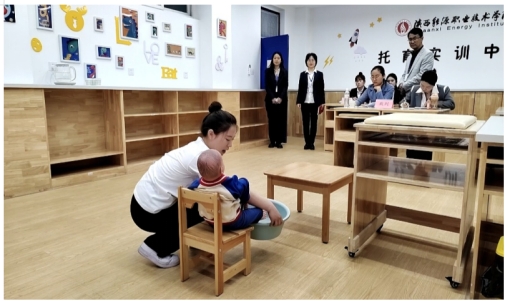 在比赛当天,选手们按抽签顺序依次进入赛场,通过生活照料、保健与护理和教育实施三个模块的考评,展示了育婴行业人才的素质和精神风貌,以及刻苦钻研、精益求精的服务热情。他们从容的表现、精彩的实操以及敬业的态度给评委们留下了深刻的印象。