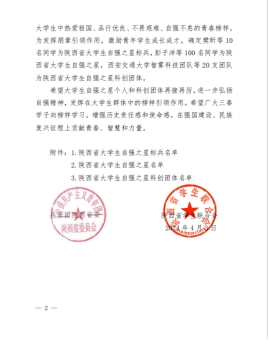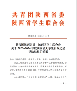 近日,由共青团陕西省委、陕西省学生联合会发文,根据《关于2023-2024年度陕西省大学生自强之星寻访结果的通报》文件精神,我校高雨卓同学荣获“陕西省大学生自强之星”称号。