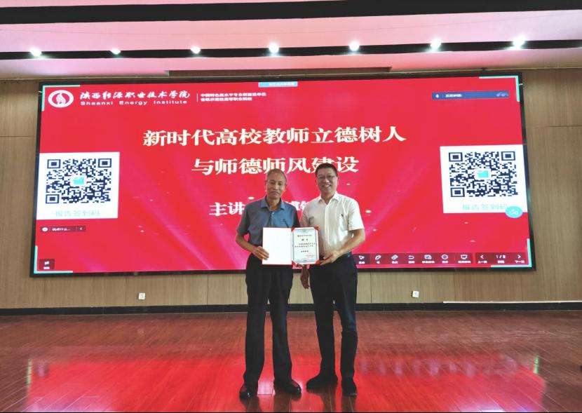6月4日,我校在实训楼六楼报告厅举办弘扬践行教育家精神首场报告会。国家级教学名师——陕西师范大学傅钢善教授受邀以“新时代高校教师立德树人与师德师风建设”为题作首场报告。校党委书记刘予东、纪委书记刘文青、全校无课教师、教研室主任、近三年新入职教师等100余人参加报告会。