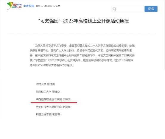 近期,由中国文艺网和中国青年网共同开展的“习艺强国”2023年高校线上公开课活动公布获奖名单,我校团委书记王皓天获评“特别支持教师”,是我省高职院校唯一获此荣誉的教师。