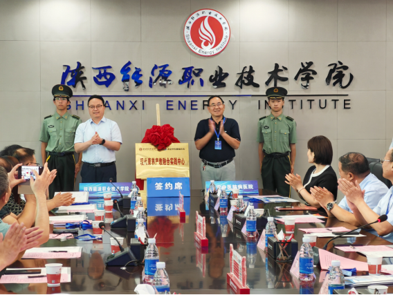 陕西康养职教集团理事长朱忠军(左一)与宋虎杰为现代康养产教融合实践中心签约揭牌