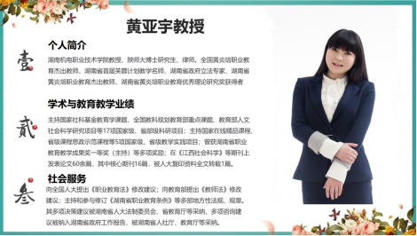 黄亚宇,现任湖南机电职业技术学院教授,同时也是陕西师范大学教育学部的博士研究生和资深律师,获得全国黄炎培职业教育杰出教师等荣誉称号。她在教育教改和科研等领域拥有深厚的学术造诣,近年来,黄教授主持了国家社科基金教育学课题、全国教科规划教育部重点课题、教育部人文社会科学研究项目等17项科研项目,主持国家在线精品课程、省级课程思政示范课程等5项田家级、省级教学实践项目,并在各类学术期刊上发表论文60余篇,其中核心期刊16篇,被人大复印资料全文转载1篇。她的社会服务也非常突出,曾向全国人大法工委和教育部政策法规司提交法律修改建议,并多次受邀在省内外百余所兄弟院校、学术团体进行教学或科研交流。