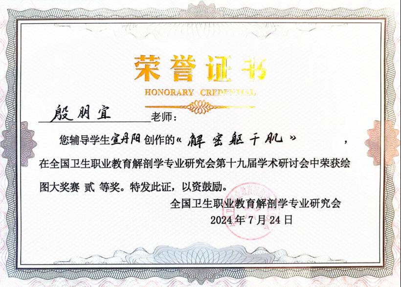 年会期间举行了“解剖学学生绘图比赛”优秀解剖学绘图作品评选,全国共有46所院校参加本次比赛,参赛作品多达230余幅,经过评委严格的评选,我校共4幅解剖绘图作品获奖。由殷朋宜老师指导,宣丹阳同学创作的作品《解密躯干肌》获得由全国卫生职业教育解剖学专业研究会及第十九届学术研讨会颁发的二等奖。由张柏林老师指导,曹李欣同学创作的作品《神经系统概观》、郝崇雅同学创作的作品《生命之秘》获得由全国卫生职业教育解剖学专业研究会及第十九届学术研讨会颁发的二等奖及三等奖。由高春妮老师指导,刘冰盈同学创作的作品《胸腹腔》获得由全国卫生职业教育解剖学专业研究会及第十九届学术研讨会颁发的三等奖。这也是我校作品首次在该赛事中获奖。