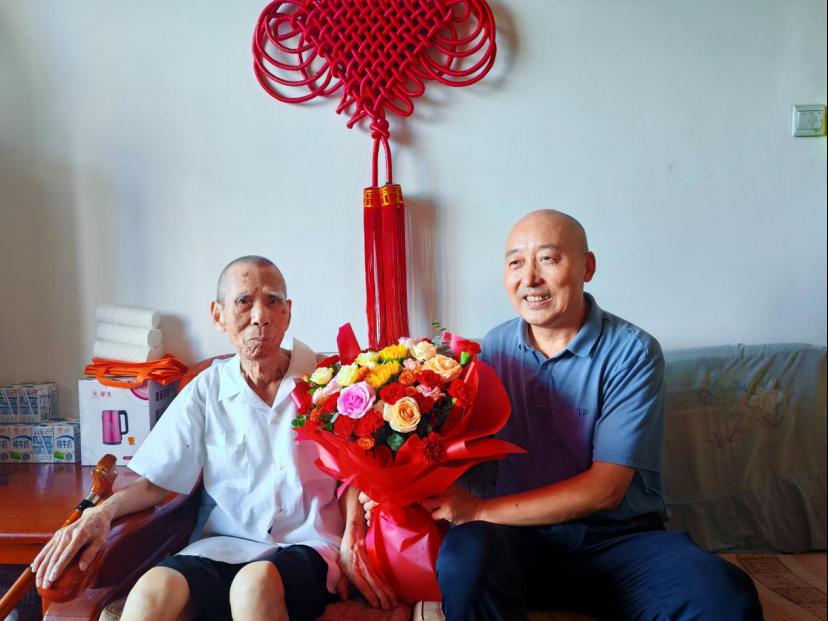 党委副书记刘文青(左)代表学校慰问离休老教师任明轩