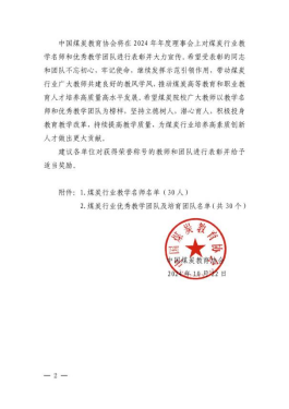10月22日,中国煤炭教育协会印发《关于公布2024年煤炭行业教学名师和优秀教学团队的通知》(中煤教协〔2024〕23号)文件,我校周少丽副教授获评全国煤炭行业教学名师,煤矿智能开采技术教学团队获评全国煤炭行业优秀教学团队。