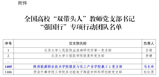 近日,教育部公布了全国高校“双带头人”教师党支部书记“强国行”专项行动团队名单,我校煤炭与化工产业学院教1党支部(以下简称煤化教工1支部)成功入选。