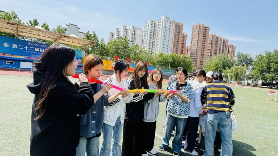 活动设置了多个趣味协作环节。在“同心协力”环节,各组用轨道接力传递乒乓球,考验成员间的细致配合;“建高塔”仅凭报纸和胶带搭建独立高塔,激发创意与协作;“一转到底挑战”中,同学们手拉手传递呼啦圈,全程不松手、不落地,现场加油声此起彼伏;“同心鼓”需要全员牵绳颠球,考验合作能力;“重重叠叠”则要求用气球托起纸杯叠塔,既需技巧又需耐心。
