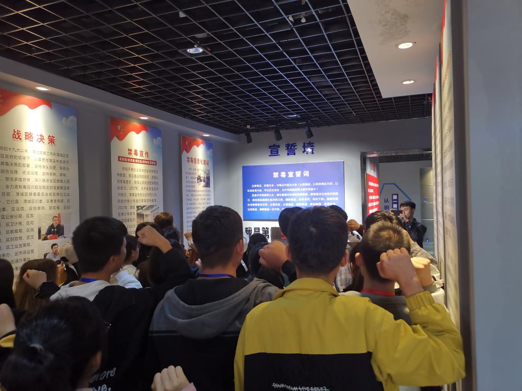 在主题教育结束前,田老师带领同学们在宣誓墙前宣誓:“远离毒品,珍爱生命,与毒品作坚决斗争!从我做起,以抵制毒品为荣,以吸毒贩毒为耻,牢记历史使命,为中华民族的伟大复兴而奋斗!”“做到毒品一日不绝,行动一日不止。”
