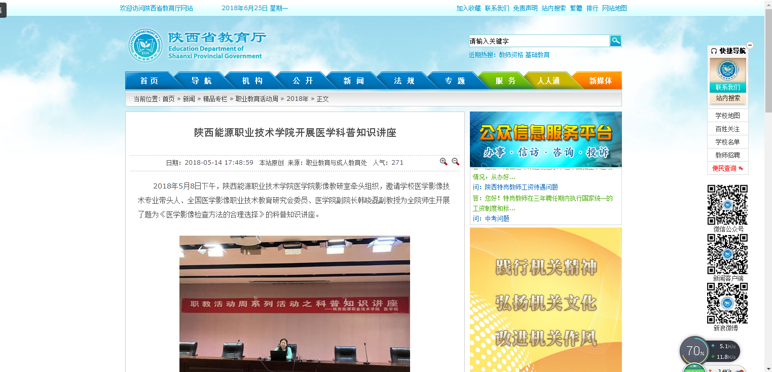 2018年5月8日下午,陕西能源职业技术学院医学院影像教研室牵头组织,邀请学校医学影像技术专业带头人、全国医学影像职业技术教育研究会委员、医学院副院长韩晓磊副教授为全院师生开展了题为《医学影像检查方法的合理选择》的科普知识讲座。
