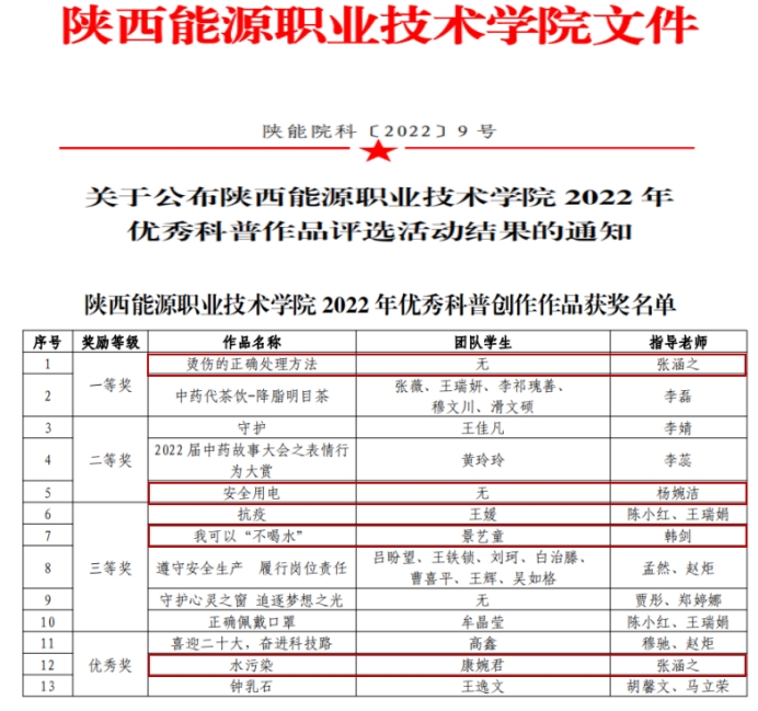 经评委组现场观看作品视频认真评选后,我院专业课教师张涵之的《烫伤的正确处理办法》、专业课教师杨婉洁的《安全用电》、由综合办副主任韩剑指导的幼管2001班景艺童的《我可以“不喝水”》分别荣获一、二、三等奖,由张涵之指导的托育2101班康婉君的《水污染》获得优秀奖。