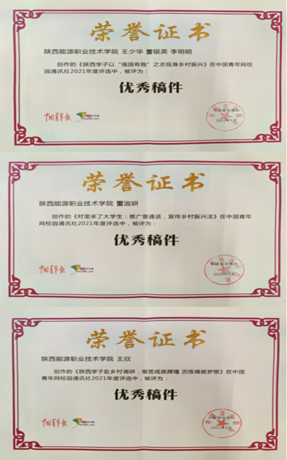 近日,中国青年网发布信息对“中国青年网校园通讯社2021年度评选活动”进行总结通报,对2021年度优秀原创稿件等进行表彰,我校共4篇稿件入选“中国青年网校园通讯社2021年度百篇优秀稿件”,其中人文与教育学院3篇。这是陕西能源职业技术学院首次在中国青年网此项活动中获奖,起到很好的示范引领作用。