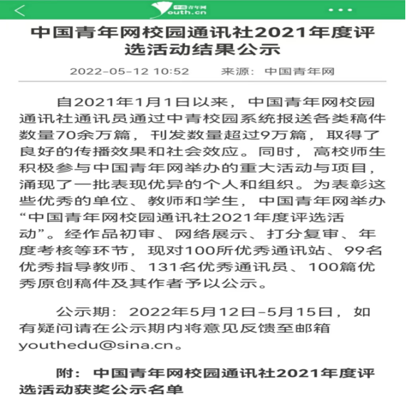 2021年度,中国青年网校园通讯社报送稿件数量70余万篇,刊发数量超过9万篇,为表彰优秀单位、教师和学生,中国青年网特举办此次评选活动。