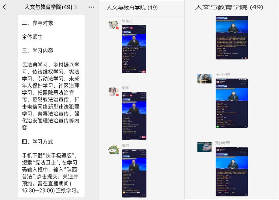 全体教工宪法学习展示:学院发动所有教师积极相应学校通知精神,展开法律学习,每天在教师群里竞相晒学习表现。