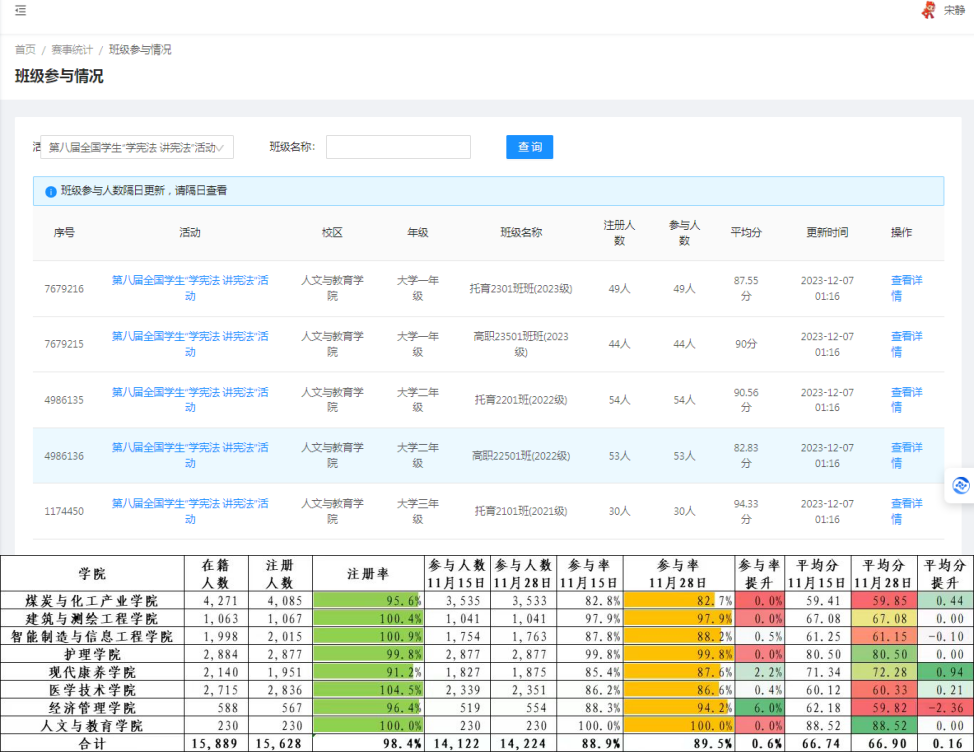 我院各班级按宪法小卫士要求,全员参与了宪法知识在线学习,练习与综合评价,并落实参与率达到100%,各班平均分高于80。(各班参与情况截图)。我院平均分(88.52)在8个二级学院平均分中名列第一的好成绩。