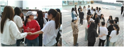 在“大树松鼠”活动当中,每两个同学做大树搭成拱桥形状,中间站一位同学做松鼠,当老师发出大树或小树的口令,同学们需要切换姿势。在嬉笑间,同学们之间的关系拉近了。