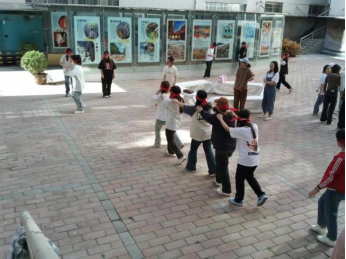 在”贪吃蛇“活动中大家带上眼罩,分散开来,唯一一个没带眼罩的同学需要引导同学们串成一串,在嬉笑中培养协作精神与信任。