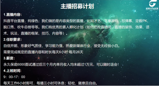 请有意向的同学加微致电,年后还有人事/运营/助播/化妆师/舞蹈师/舞美等诸多岗位,有任何问题可以随时咨询!人事经理:包安朗13659216787(微信同步)