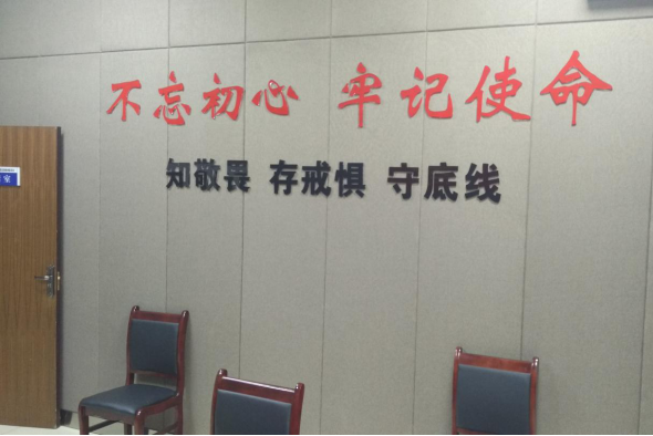 谈话室设在办公楼一层,室内墙壁上,一面是鲜红的党旗和入党誓词,另一面是“知敬畏 存戒惧 守底线”等警示语,谈话桌上明示《谈话规范》和《谈话纪律》。谈话室严格按标准建设,设置安全防护,安装全程同步录音和无死角的录像设备,具备全程实时同步录像、录音、存储、检索等功能。