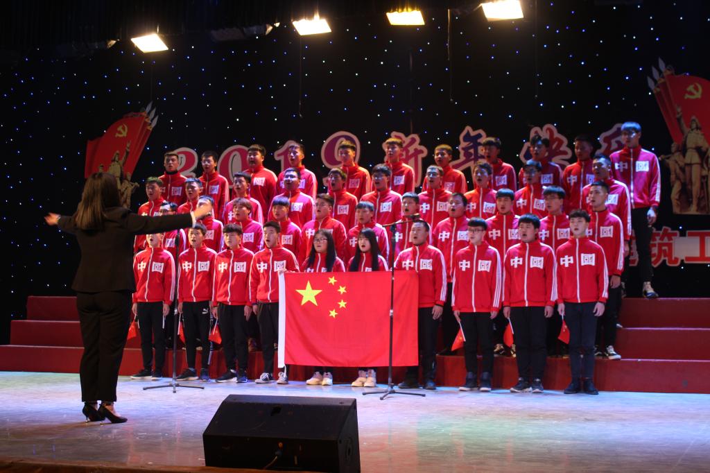 建装、展示1701班的《中国中国鲜红的太阳永不落》掀开了大合唱比赛的帷幕。其中建工1801班《歌唱祖国》内容丰富配有朗诵、横幅、国旗等元素表达对祖国的热爱;建工1702班的同学手持国旗喊出“不忘初心 砥砺前行,祖国我爱你”口号,振奋人心;更有建管、供热1801的《十送红军》,班主任张莉老师与同学们同台伴舞,赢得在场老师同学们的阵阵掌声;所有班级都以最佳状态,唱出了身为华夏儿女的骄傲和自豪,唱出了新时代大学生跟党走的鉴定信念。买中傲院长带来的《绣金匾》将现场气氛推向了高潮,并为本次合唱比赛画上圆满句号。