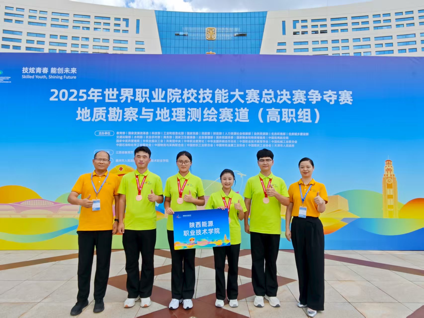 8月25日至30日,2025年世界职业院校技能大赛总决赛争夺赛地质勘察与地理测绘赛道(高职组)在江西应用技术职业学院隆重举行。经过激烈角逐,由我校建筑测绘学院教师崔团团、唐凝指导,无人机2301班赵静、测量2301班赵力、无人机2401班刘雄、测量2401班王月明四位同学组成的师生代表队凭借出色表现,最终荣获大赛铜奖,展现了我校师生精湛的专业技能和良好的精神风貌。