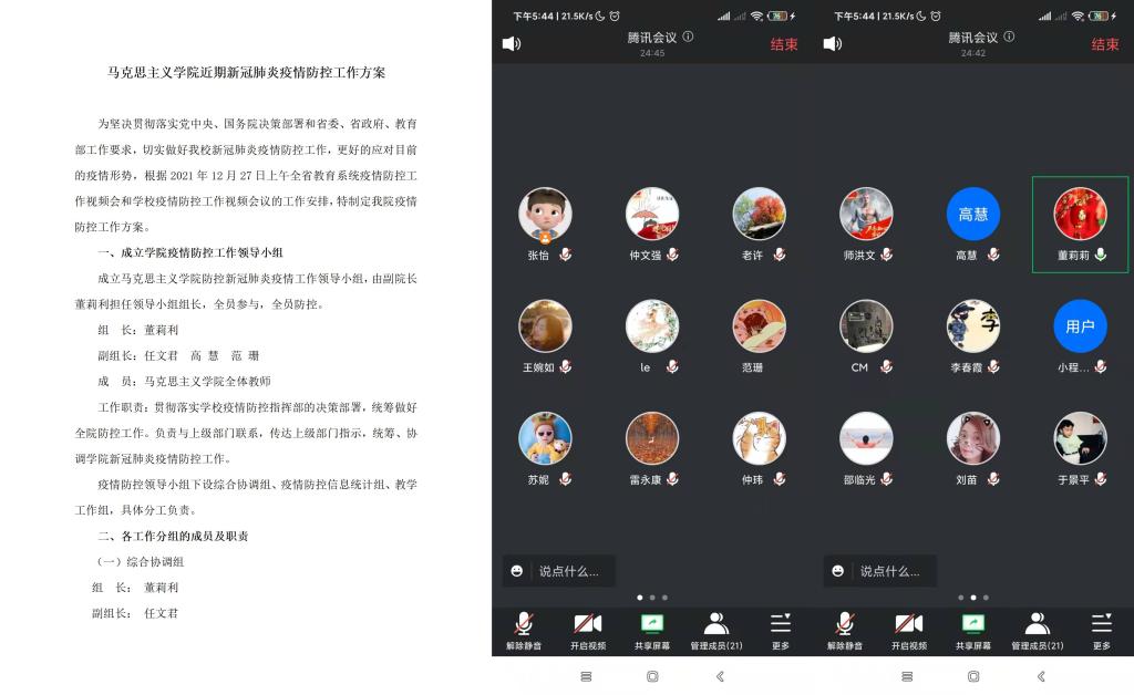 提高政治站位,强化责任担当。疫情就是命令,防控就是责任。学校部署疫情防控工作以来,马克思主义学院迅速行动,制定了《马克思主义学院近期新冠肺炎疫情防控工作方案》,成立了由马克思主义学院副院长董莉利为组长的马克思主义学院防控新冠肺炎疫情工作领导小组,负责学院的疫情防控工作。期间,马克思主义学院召开疫情防控线上会议,积极传达落实学校各项防疫规定,要求全体教师要统一思想,提高政治站位,强化责任担当,严格贯彻执行学校党委的部署要求。