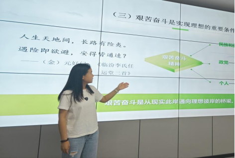 此次备课会主要围绕“思想道德与法治”课程专题三第三讲“在实现中国梦的实践中放飞青春梦想”展开。李晓琪运用“人民医护工作者”路生梅的事例导入新课,引导学生正确认识理想与现实之间的辩证关系,并以视频《百年航母梦》阐释理想实现的长期性、艰巨性和曲折性;围绕“当代青年还需要艰苦奋斗吗?”展开讨论,使学生正确认识艰苦奋斗的时代内涵,继续弘扬艰苦奋斗精神。在第二部分““我的理想只有我”,行不行?”中,以“在自家客厅收麦子的大忙人——王林生教授”的故事探讨个人理想与社会理想之间的关系,鼓励青年人只有把人生理想融入国家和民族的事业中,方能实现个人的人生理想。在“为实现中国梦注入青春能量”部分,以视频“时代各有不同,青春一脉相承”过渡,运用2024年五四奖章获得者“焊接一姐”胡奉雅的故事和本校暑期社会实践学生不畏艰险,投身防汛救灾一线的事迹,帮助学生理解如何将报国理想转化为实际行动。