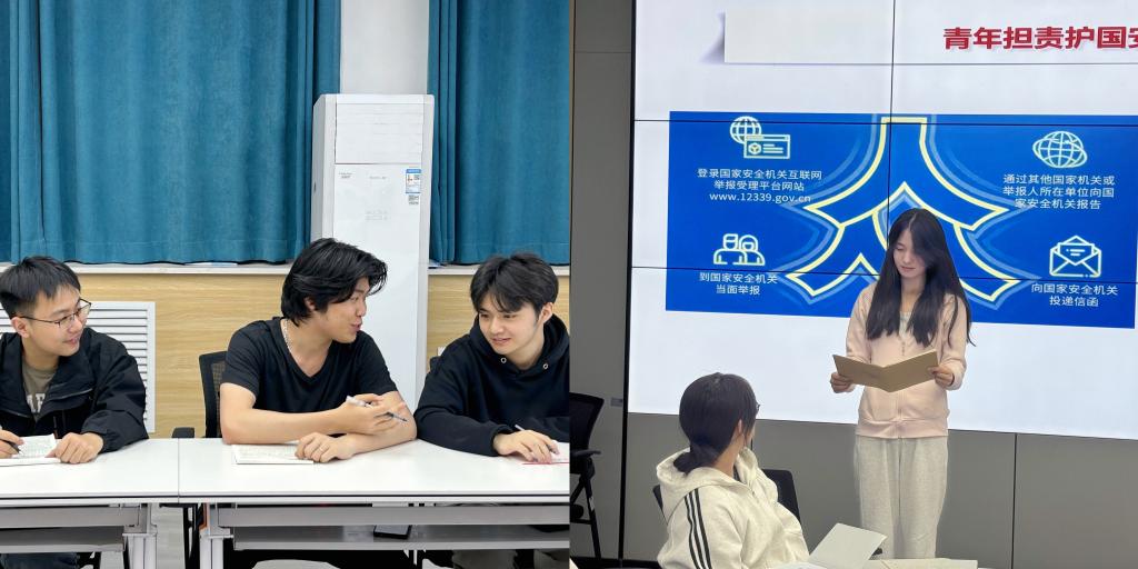杨淑妮老师以第十个全民国家安全教育日主题宣传片《守护•十年》作为切入点,从“历史之鉴、现实之需、未来之要”三个方面引导学生深入理解国家安全是民族复兴的根基,社会稳定是国家强盛的前提。接着,杨淑妮老师组织学生讨论“作为新时代青年,如何守护国家安全?”,同学们积极参与,从增强国家安全意识、守好日常“安全红线”、防范境外势力渗透、发现可疑情况时及时向国家安全机关报告等方面分享自己的见解。最后,所有同学参加了中国大学生在线开展的“全国大学生国家安全知识答题”活动,掌握了国家安全相关法律法规,并通过题目解析深入了解了国家安全的多维度内涵。